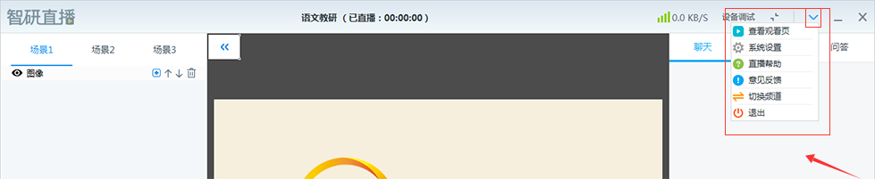 6、 点击右上角的倒三角按钮,选择“查看观看页”,观看直播,或进入智研直播直播系统后台,选择“直播分享链接”观看直播。注意关闭观看页的声音,以免造成回声;